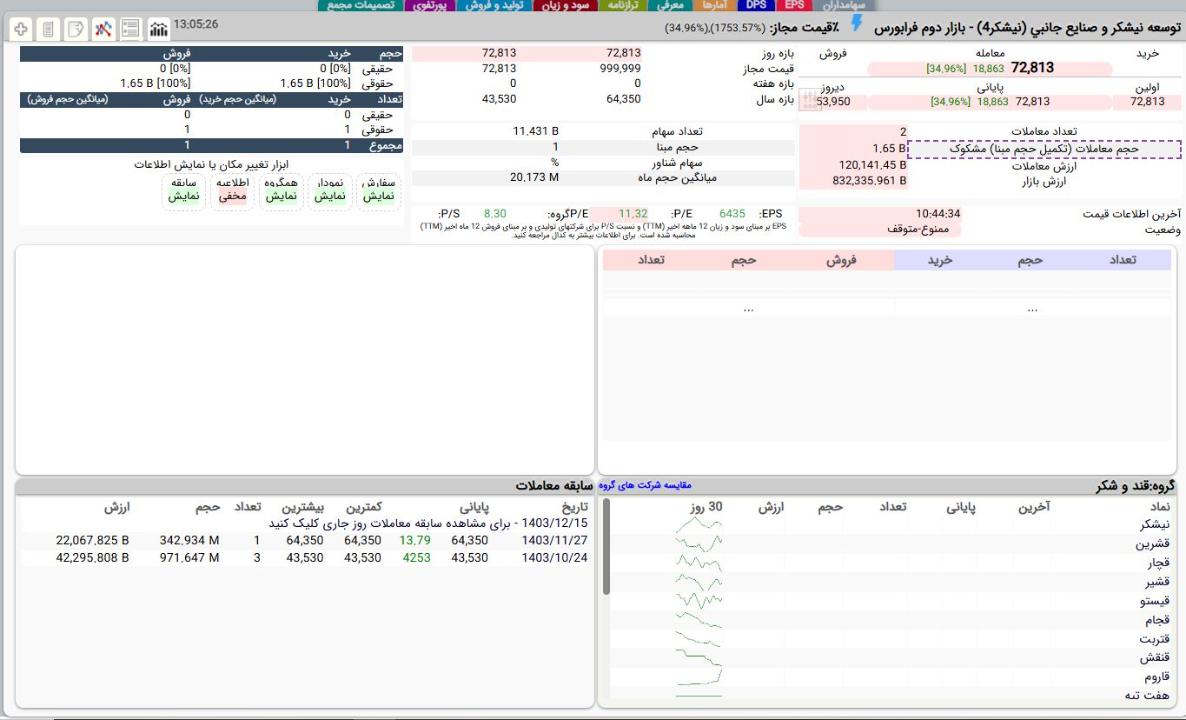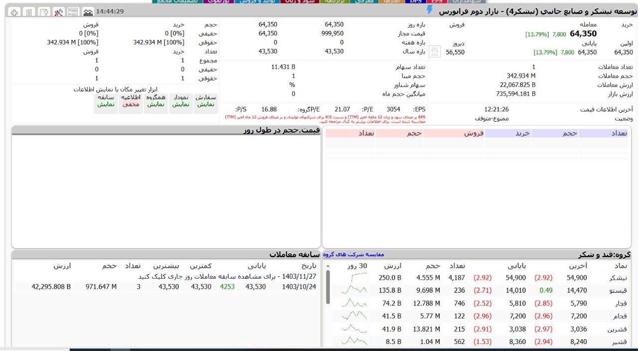امروز 27 بهمن 1403 مقدار 3 درصد سهام #نیشکر توسط #وسپهر به فروش گذاشته شد و در قیمت 6435 تومان معامله شد. باید فردا ببینیم خریدار این معامله عمده کدام شرکت بوده است. نیشکر از شرکت هایی است که سهامش به تازگی در بورس بصورت عرضه اولیه تقدیم عموم شد!