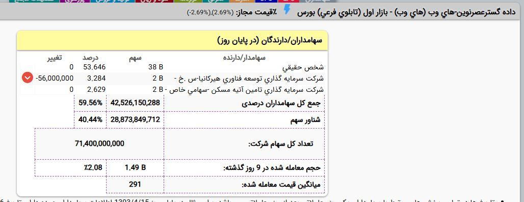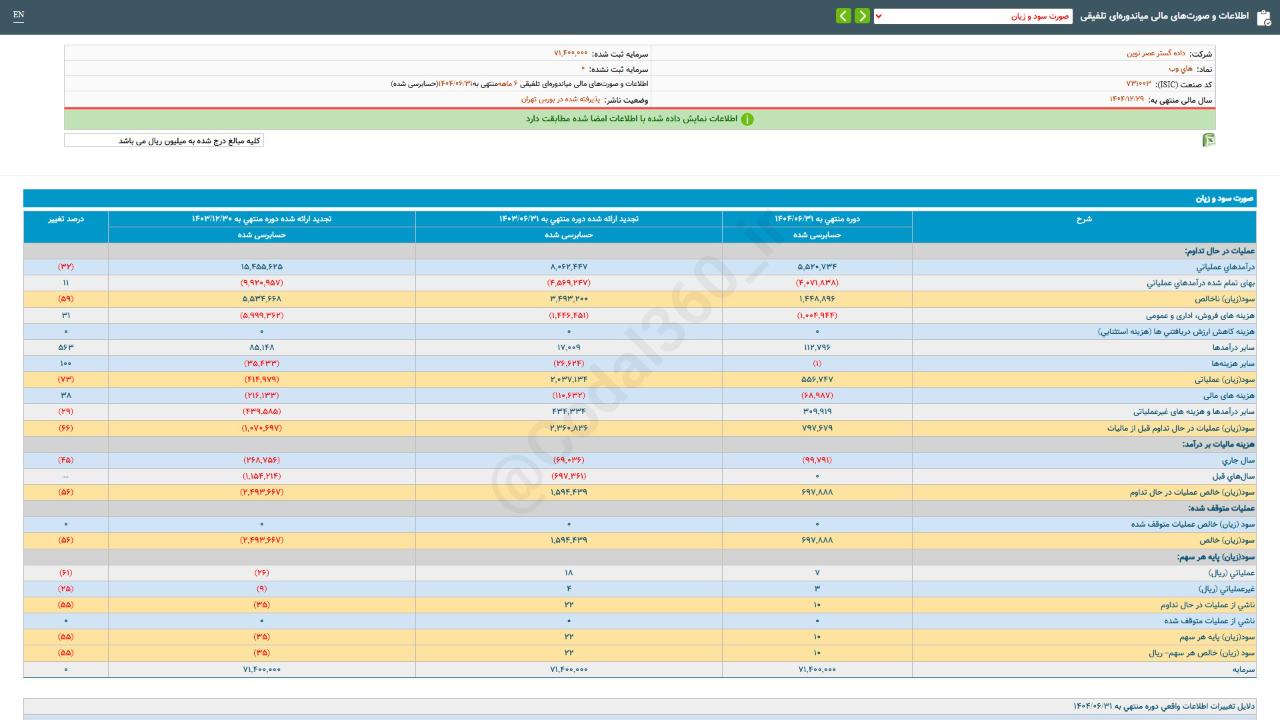 ▪️ «های وب» با سرمایه ثبت شده 71,400,000 میلیون ریال طی عملکرد 6 ماهه منتهی به 14040631 مبلغ 697,888 میلیون ریال سود شناسایی کرده است.