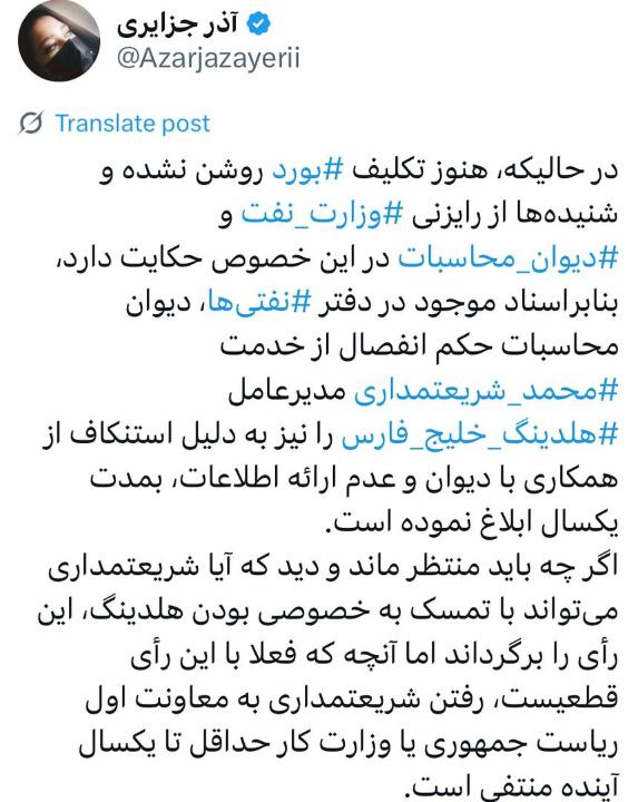 #فارس #شریعتمداری #هلدینگ_خلیج_فارس #انفصال_از_خدمت