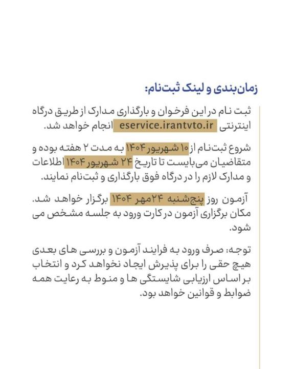 ثبت نام در این فراخوان و بارگذاری مدارک از طریق درگاه اینترنتی https:eservice.irantvto.ir انجام خواهد شد.