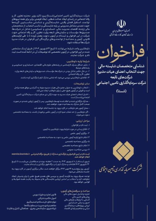 انتخاب داوطلبین به عنوان عضو مالی هیات مدیره منوط به گذراندن موفق همه مراحل است و قبولی در آزمون هیچ حقی را برای داوطلب ایجاد نمیکند.