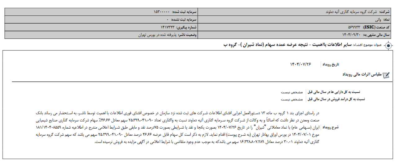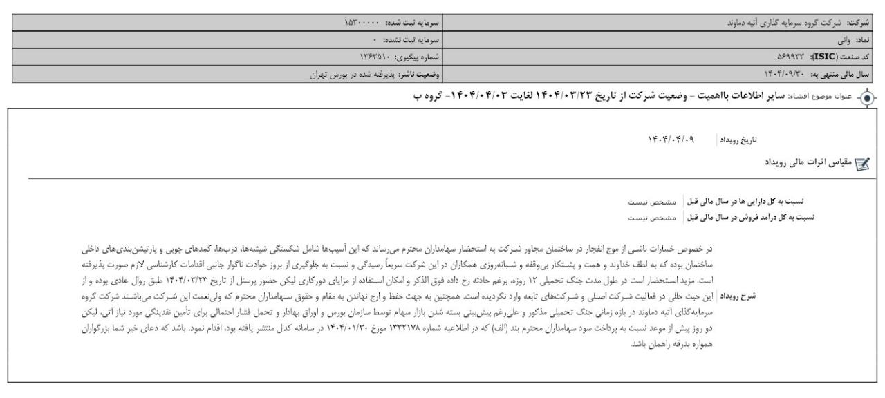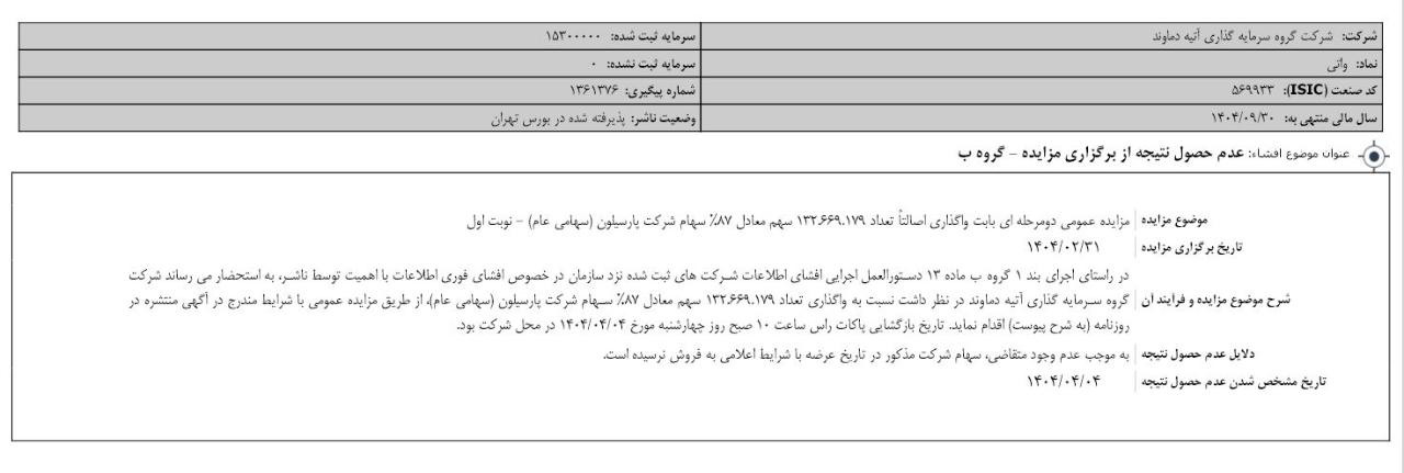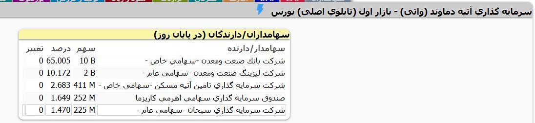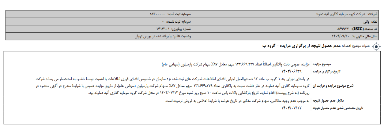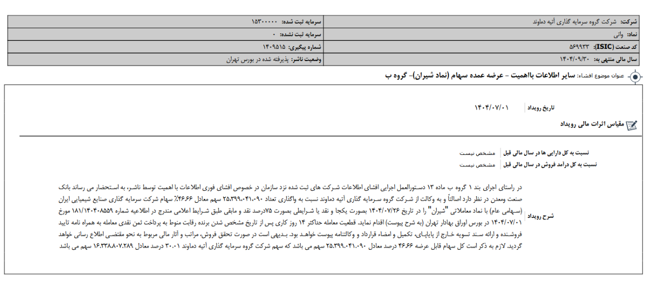 در نماد واتی امروز 28 تیر ماه 1404 تعداد 20 میلیون سهم به صورت بلوکی معامله گردید فروشنده و خریدار سرمايه گذاري آتيه دماوند در این معامله بلوکی حقوقی بود.قیمت هر سهم 3960 ریال بود.