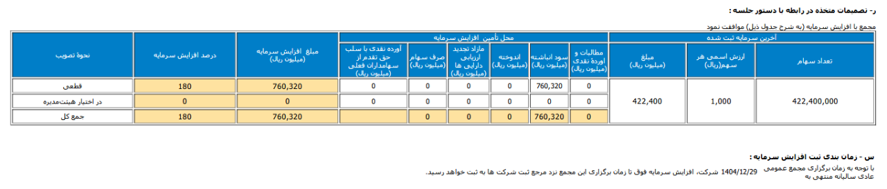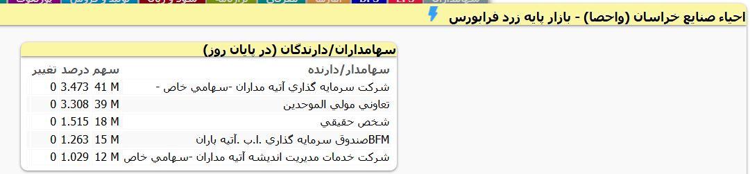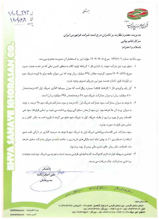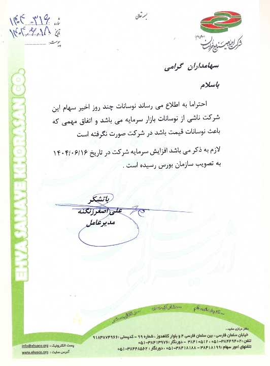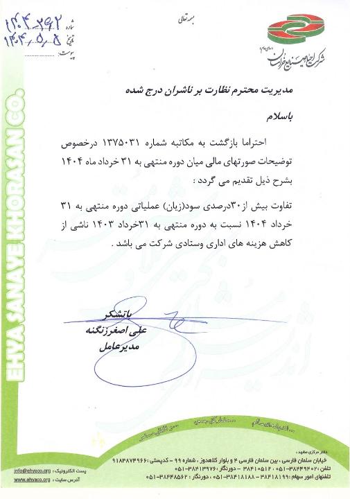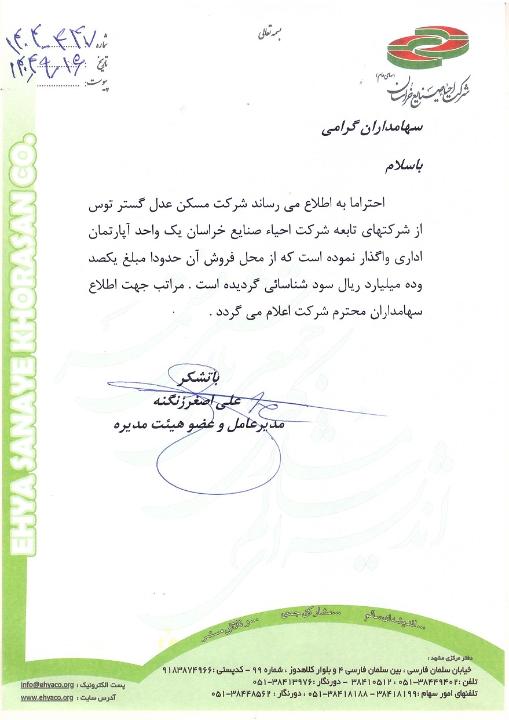 مجمع عمومی عادی بطور فوقالعاده شرکت احياء صنايع خراسان راُس ساعت 09:00 روز شنبه مورخ 14040518 درمحل خيابان سلمان فارسي بين سلمان 4 و تقاطع کلاهدوز پلاک 99 برگزار گردید و به حد نصاب قانونی نرسید. تعداد 3.53 درصد سهامداران شرکت کرده بودند.