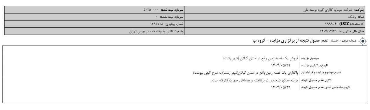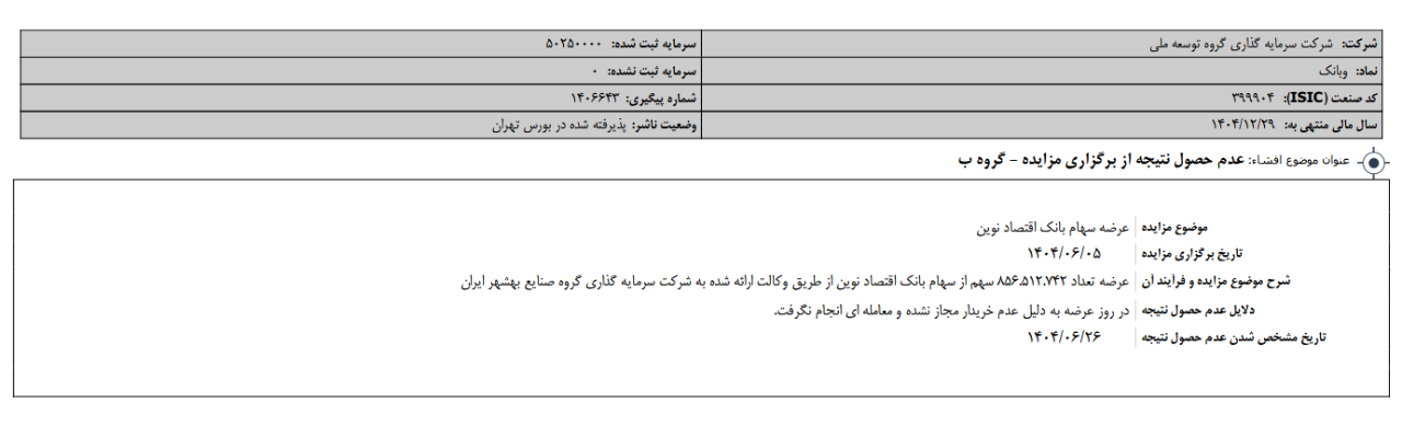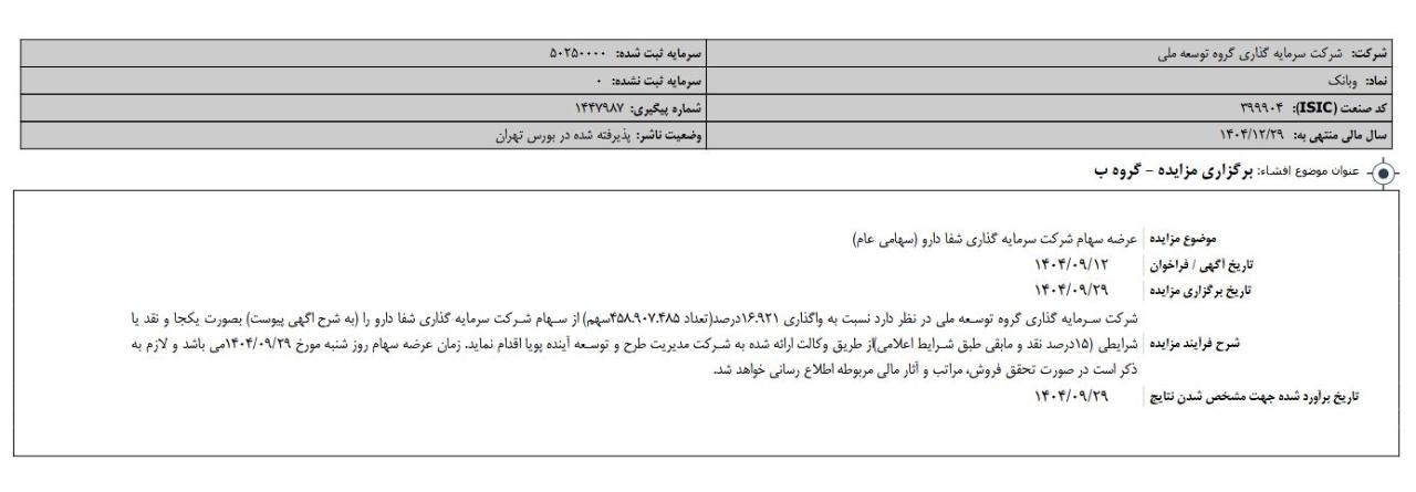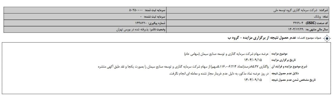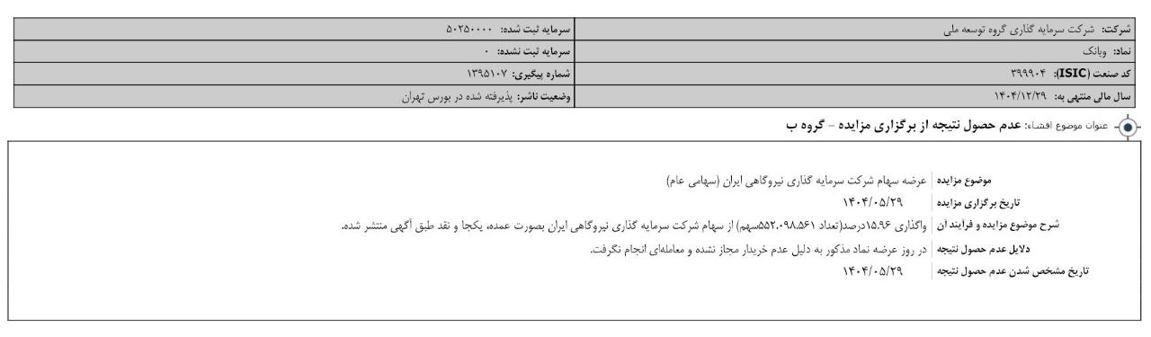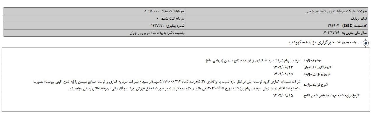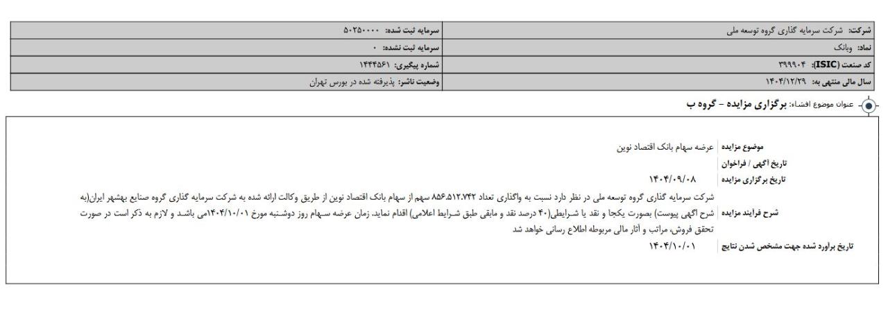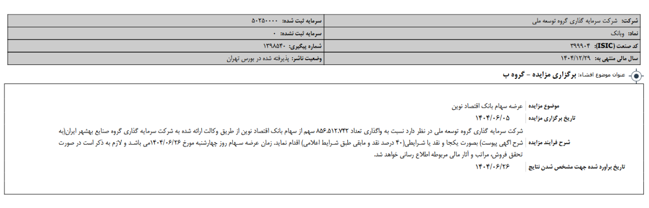 شرکت کارگزاری بانک ملی ایران طی نامه ای که روز 3 آبان به سازمان فرابورس داده اعلام کرده مقدار 552 میلیون و 98 هزار و 561 سهم معادل 15.96 درصد سهام مدیریتی غیرکنترلی شرکت سرمايه گذاري نيروگاهي ايران در قیمت پایهقیمت پایانی در روز قبل از تاریخ عرضه یا تاریخ انتشار آگهی عرضه هریک بالاتر باشد به اضافه 25 درصد قیمت مذکور . در روز 30 آبان 1404 به نمایندگی از شرکت سرمایه گذاری گروه توسعه ملی عرضه خواهد شد.بصورت نقد و اقساط! قیمت فعلی سهم در روز 3 آبان 13960 ریال میباشد.