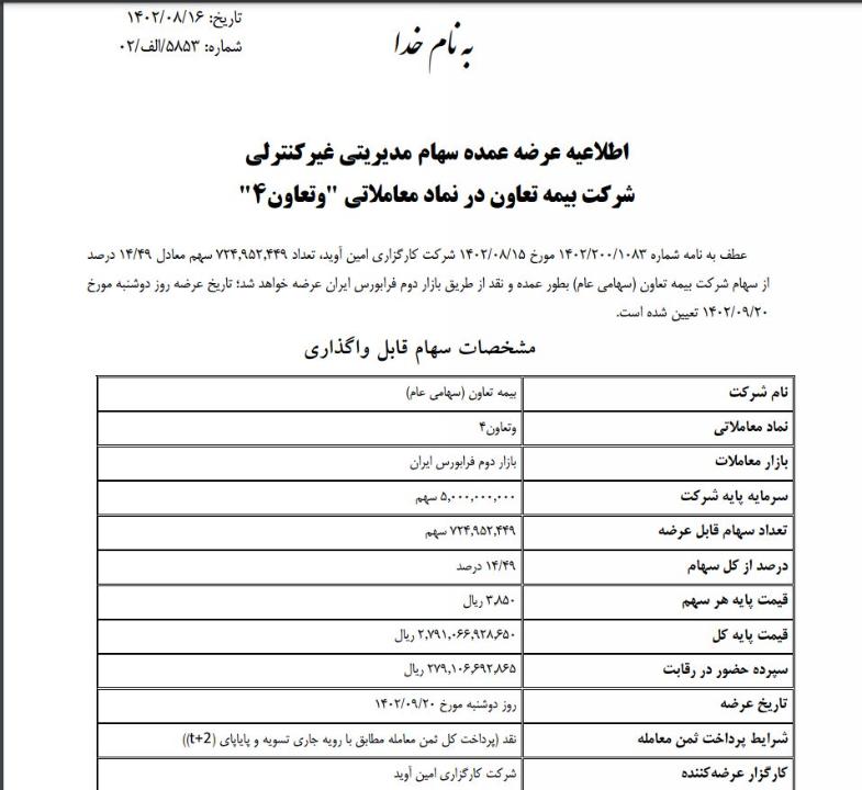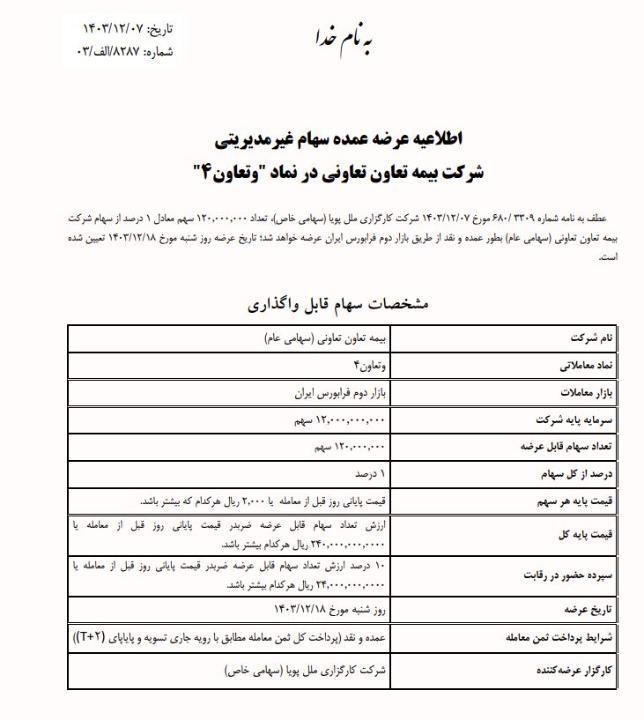 شرکت کارگزاری ملل پویا طی نامه ای که روز 7 اسفند به سازمان فرابورس داده اعلام کرده مقدار 120 میلیون سهم معادل یک درصد سهام غیرمدیریتی شرکت بیمه تعاون در قیمت پایه قیمت پایانی روز قبل از معامله یا 2,000 ریال هرکدام که بیشتر باشد. در روز 18 اسفند 1403 به نمایندگی از شرکت سرمایه گذاری مالی ملل عرضه خواهد شد.بصورت نقد ! قیمت فعلی سهم در روز 15 اسفند ماه 1521 ریال میباشد.