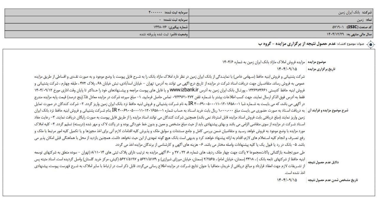 افشای اطلاعات بااهمیت،انتقال مالکیت ۵ قطعه زمین به نام بانک ایران زمین- گروه ب