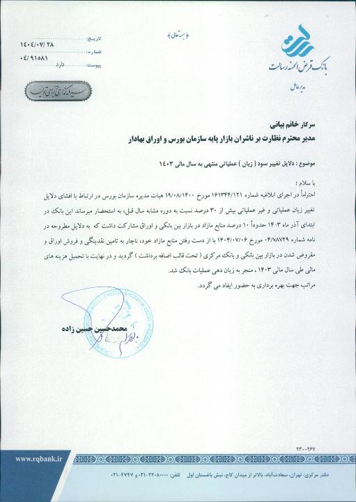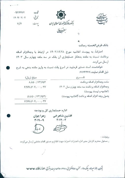 #وسالت پیرو مجمع نوبت اول مورخ 14040515 که به حد نصاب نرسید از کلیه سهامداران ، وکیل یا قائم مقام قانونی صاحب سهم و همچنین نماینده یا نمایندگان اشخاص حقوقی دعوت میگردد تا در جلسه مجمع عمومی این شرکت که در ساعت 14:00 روز یکشنبه مورخ 14040909 در استان تهران ،شهر تهران به آدرس خيابان طرشت ، بلوار شهيد اکبري ، خيابان شهيد قاسمي شرقي ، سالن اجتماعات جهاد دانشگاهي صنعتي شريف برگزار میگردد حضور بهم رسانند.
