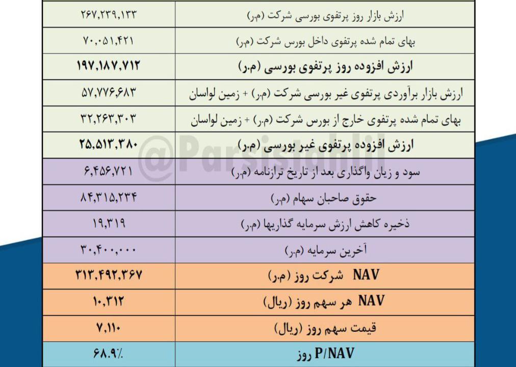 بدین ترتیب NAV هر سهم #وسپه 10,312 ریال و نسبت PNAV روز شرکت 69 درصد می باشد.