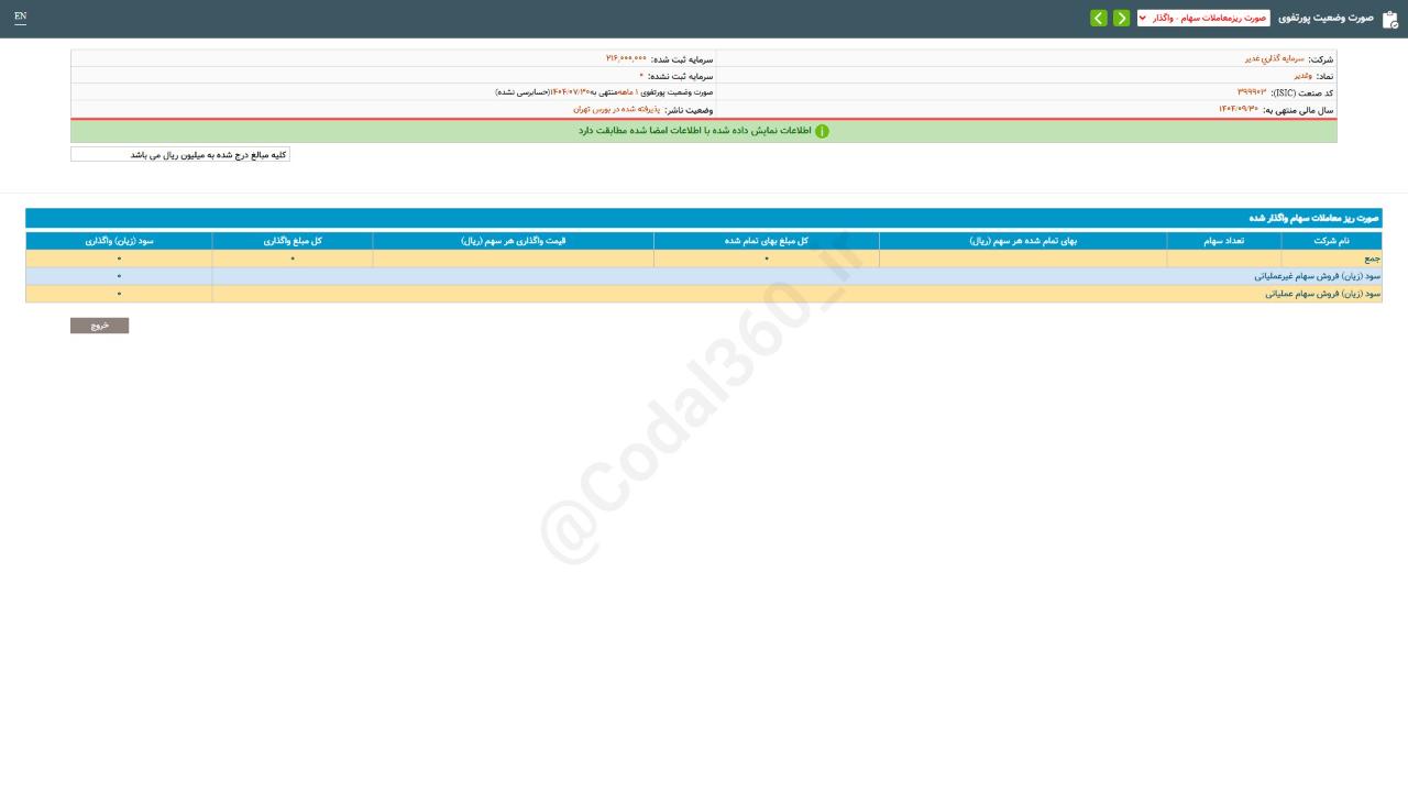 ▪️ وغدیر با سرمایه ثبت شده 216,000,000 میلیون ریال طی عملکرد 2 ماهه سال مالی منتهی به 14040930 از محل سود سهام محقق شده سودی محقق نکرده است