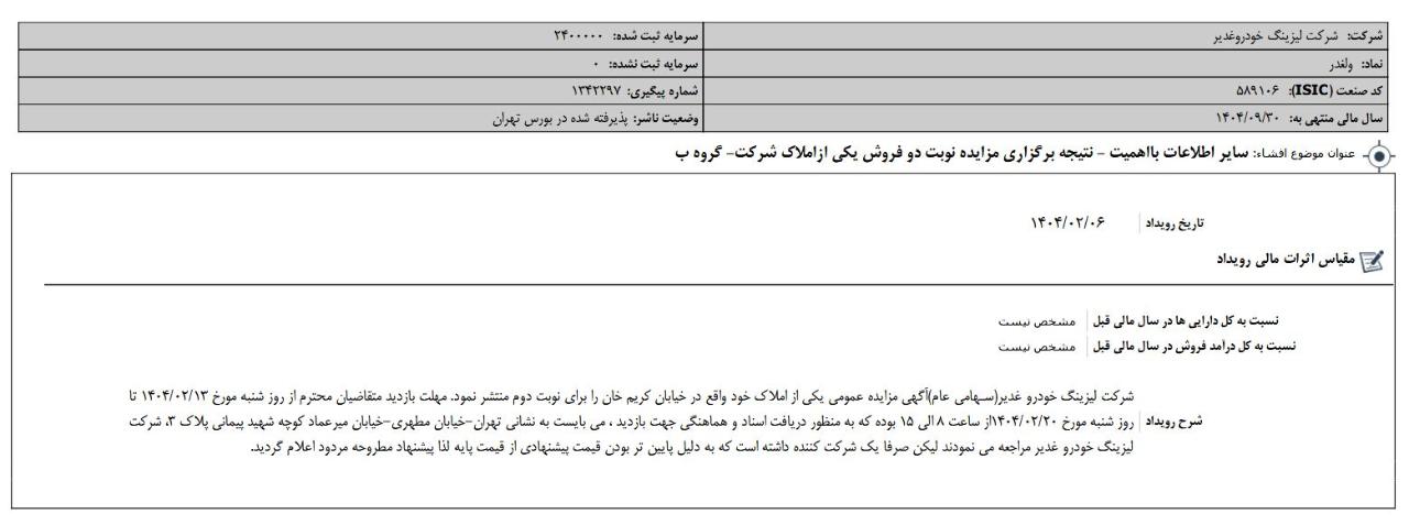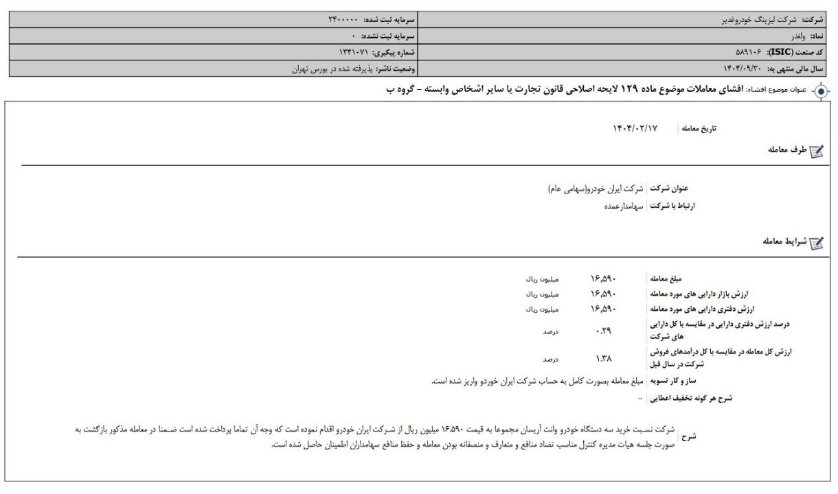 #ولغدر با فروشی که در این نماد داشت از جمع سهامداران بالای ی درصد این شرکت خارج شد. این شرکت لیزینگی در طی دو هفته اخیر بالای 40 درصد رشد قیمتی داشته و از 1928 ریال به 2691 ریال رسیده است.