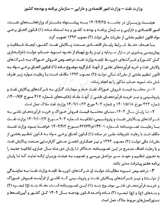 ۳. همچنین مقرر شد تا تسویه بدهیهای دولت به پالایشگاهها از محل تخصیص خوراک آنها انجام شود.