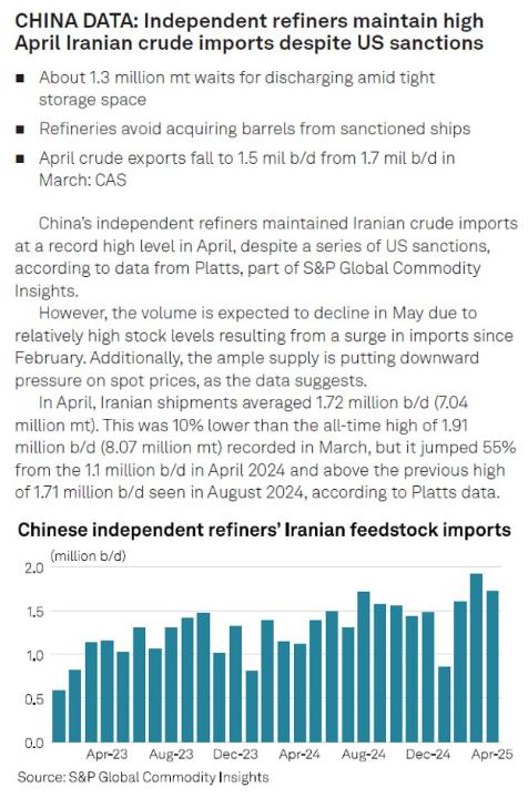 🟠واردات بالا، همراه با کاهش قیمتها، نشان میدهد که مشکلات لجستیکی ناشی از مجموعهای از تحریمهای ایالات متحده تا حد زیادی برطرف شده است. تا تاریخ 8 می، نفت خام سبک ایران با تخفیفهای 2 تا 2.5 دلار بر بشکه نسبت به ICE برنت عرضه میشد، که نسبت به تخفیفهای 1.5 تا 1.7 دلار بر بشکه در اوایل اپریل، بیشتر شده است.