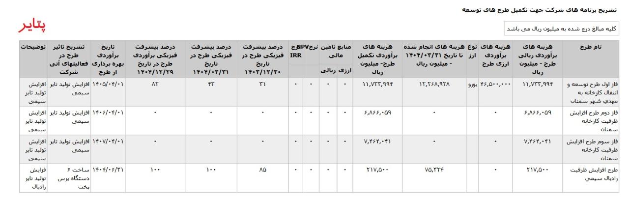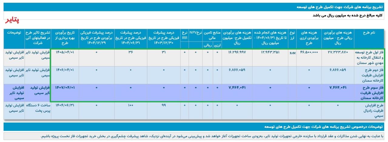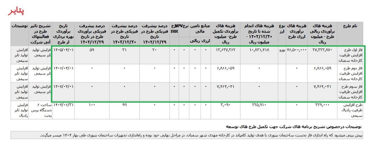 *فاز اول طرح افزایش ظرفیت کارخانه سمنان،با هزینه ی برآوردی تکمیل طرح معادل 1.364 میلیارد تومان که تاریخ برآوردی بهره برداری از طرح تیر1405 اعلام شده است.