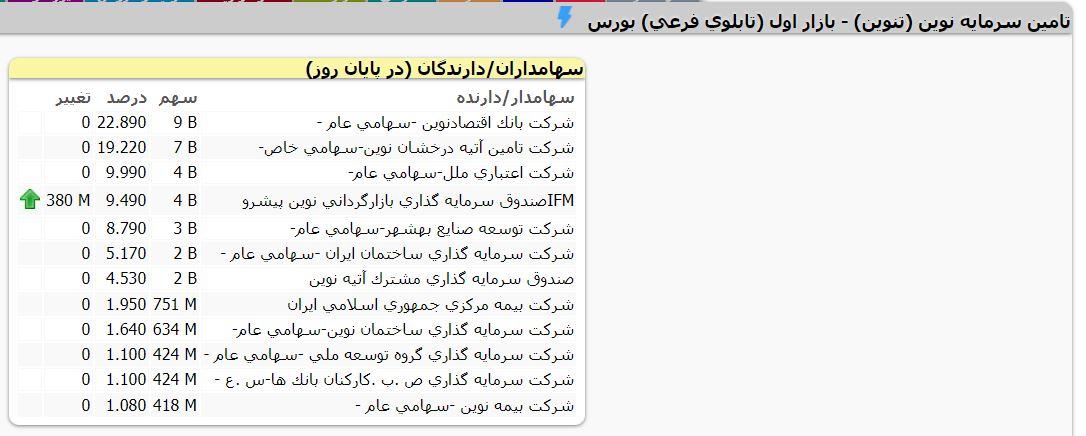 دیروز 12 خرداد ماه در نماد #تنوین 380 میلیون سهم بصورت بلوکی در قیمت میانگین 1337 ریال معامله شد که خریدار این معامله IFMصندوق سرمايه گذاري بازارگرداني نوين پيشرو بود و فروشنده سهم هم صندوق سرمایه گذاری مشترک یکم ایرانیان بود که با این فروش از جمع سهامداران بالای یک درصد شرکت خارج شد. با اینحال بیش از 200 میلیون سهم هنوز در #پرتفوی خود دارد!