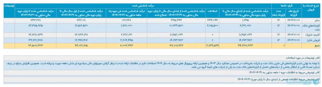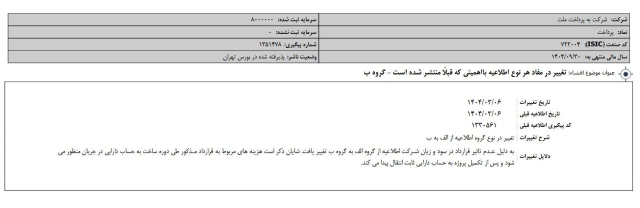 در این صورت‌مالی آمده است: «با توجه به نهایی شدن قراردادهای مابین بانک ملت و شرکت به‌پرداخت در خصوص عملکرد سال ۱۴۰۳ و همچنین ارائه پروپوزال‌های مربوط به سال ۱۴۰۴ اصلاحات لازم در اطلاعات ارائه شده با درنظر گرفتن صورت‌های ‌مالی میاندوره‌ای ۶ماهه صورت پذیرفته است. همچنین افزایش مبلغ در ردیف سایر عمدتا ناشی از انتقال بخشی از درآمدهای حاصل از قراردادهای بانک ملت به یکی از شرکت‌های تابعه گروه است.»