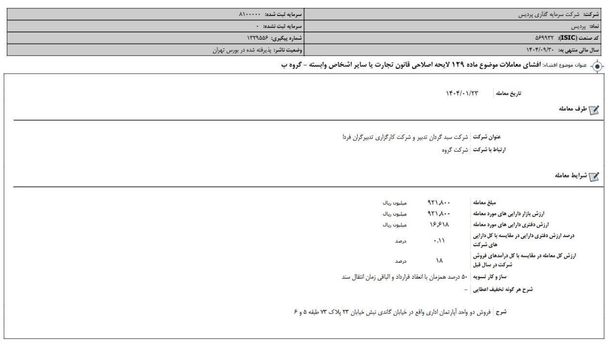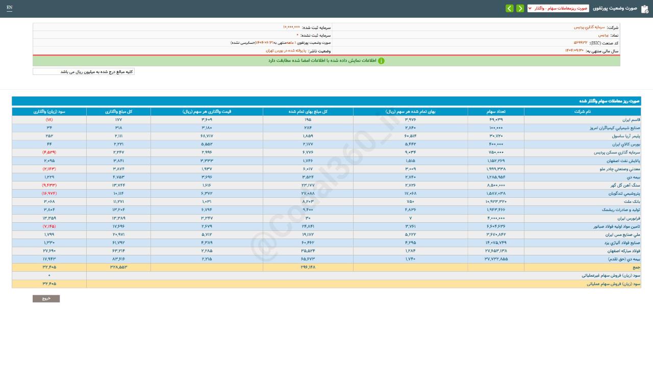 ▪️ سرمایه گذاری پردیس طی عملکرد 1 ماهه منتهی به 14040631 از معاملات واگذاری سهام 32,405 میلیون ریال درآمد داشته است