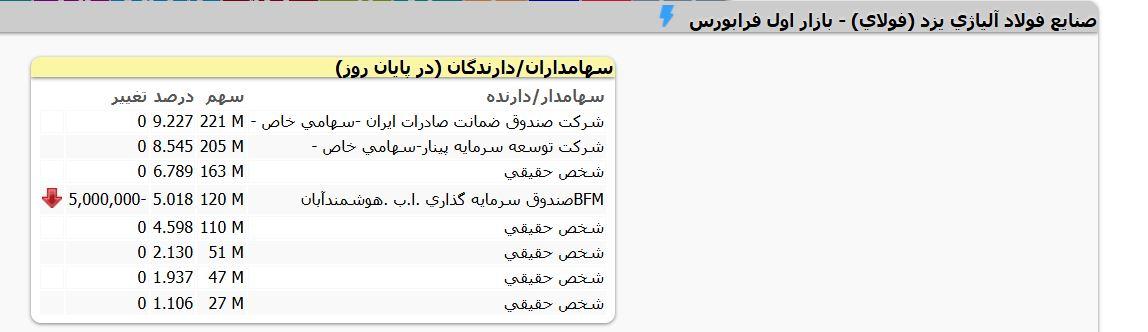 دیروز 11 شهریور 1404 شرکت سرمایه گذاری پردیس با فروشی که در نماد #فولای داشت از جمع سهامداران بالای یک درصد این شرکت خارج شد. در ضمن شرکت سرمایه گذاری هوشمند آبان اقدام به فروش 5 میلیون سهم نمود..