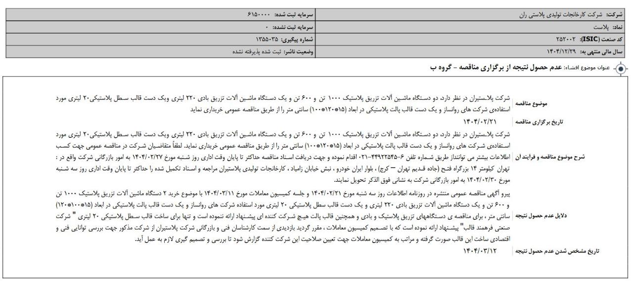 مجمع عمومی عادی سالیانه شرکت کارخانجات توليدي پلاستیران روز 8 مرداد 1404 با حضور 60.59 درصد سهامداران برگزار شد و با تصویب مجمع از سود 164 ریالی ایجاد شده مبلغ 18 ریال بین سهامداران تقسیم شد.
