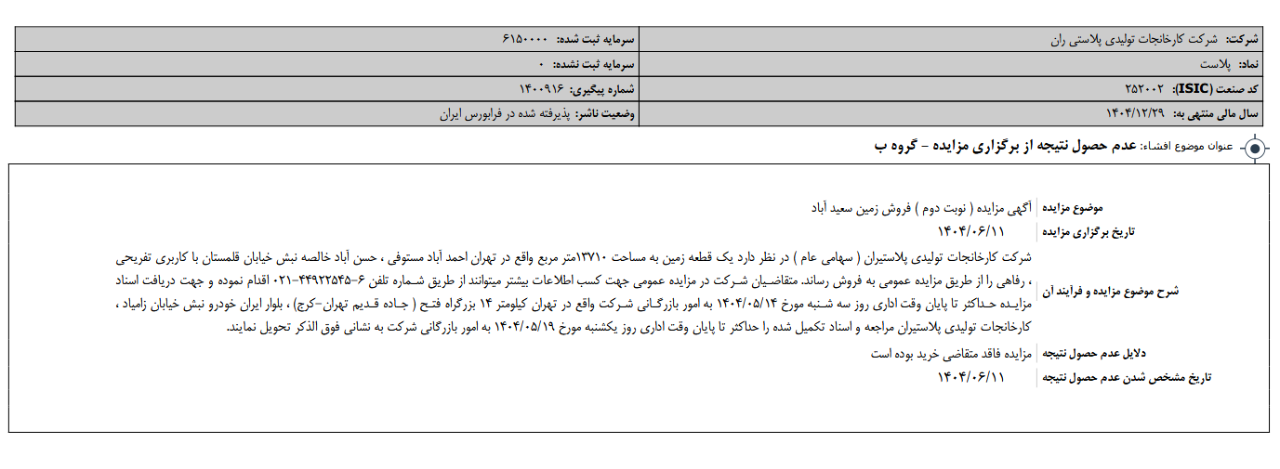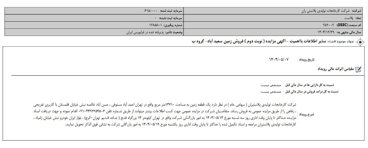 افشای اطلاعات بااهمیت، آگهی مزایده {نوبت دوم} فروش زمین سعید آباد-گروه ب