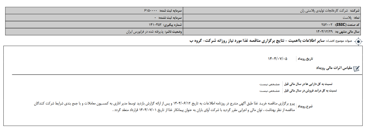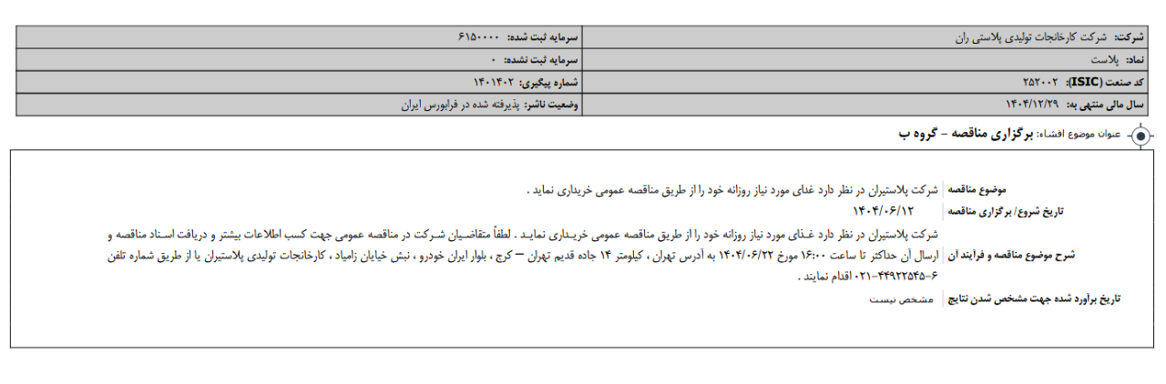 افشای اطلاعات بااهمیت، نتایج برگزاری مناقصه غذا مورد نیاز روزانه شرکت-گروه ب