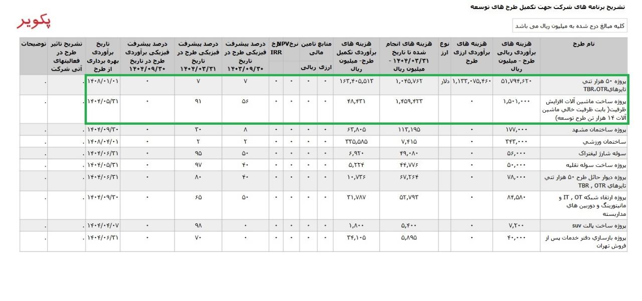 *پروژه ۵۰ هزار تني تايرهايTBR،OTR،با هزینه ی برآوردی تکمیل طرح معادل 16.024 میلیارد تومان که تاریخ برآوردی بهره برداری از طرح در مهر1408 اعلام شده است.