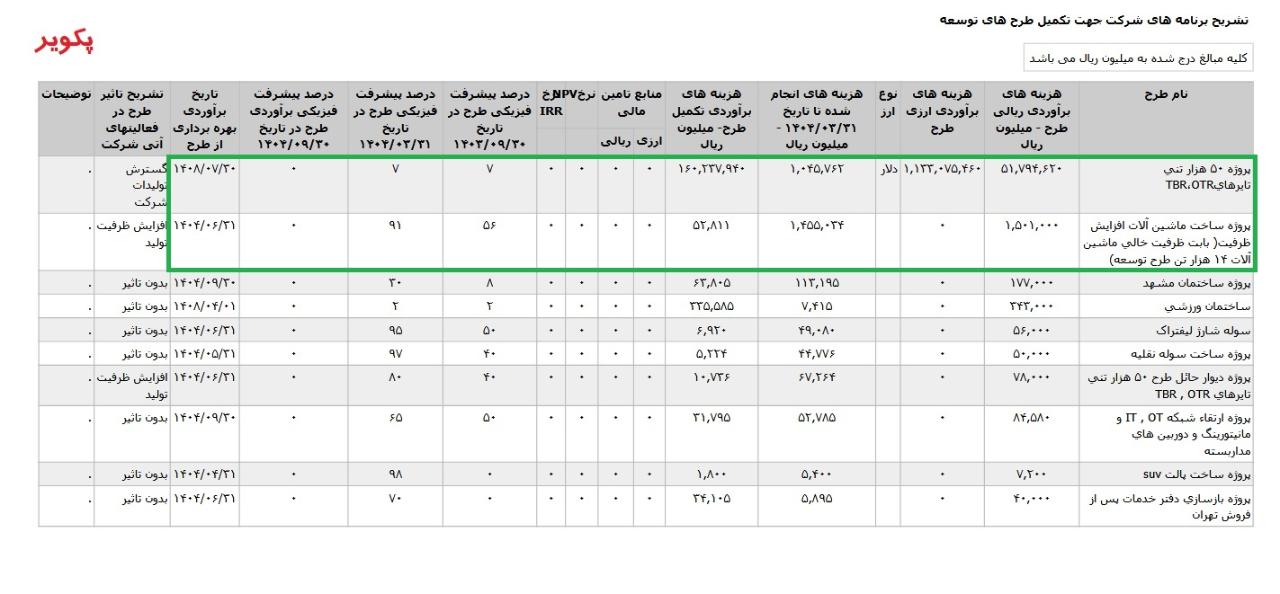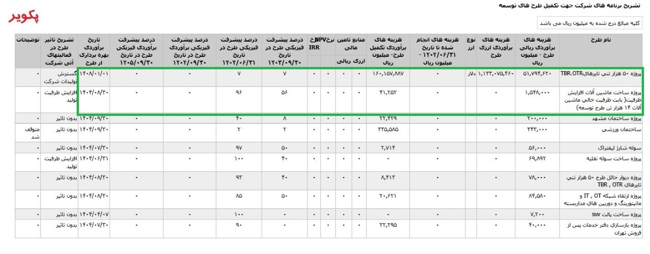 *پروژه ۵۰ هزار تني تايرهايTBR،OTR،با هزینه ی برآوردی تکمیل طرح معادل 16.016 میلیارد تومان که تاریخ برآوردی بهره برداری از طرح در فروردین1408 اعلام شده است.