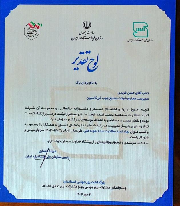 شرکت صنایع چوب خزر کاسپین وابسته به شستا برنده جایزه نهاد تایید صلاحیت شده نمونه ملی در روز جهانی استاندارد شد.