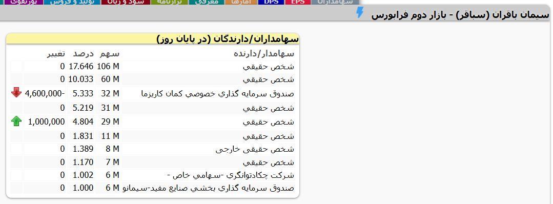 #سباقر داشت به جمع سهامداران بالای یک درصد این شرکت پیوست. در ضمن صندوق سرمايه گذاري خصوصي كمان كاريزما اقدام به فروش 4.6 میلیون سهم نمود. و یکی از سهامداران حقیقی بالای یک درصد شرکت هم یک میلیون سهم در بازار خریداری نمود. یک روز شلوغ و پرگردش در سهامداران بالای یک درصد سیمان باقران
