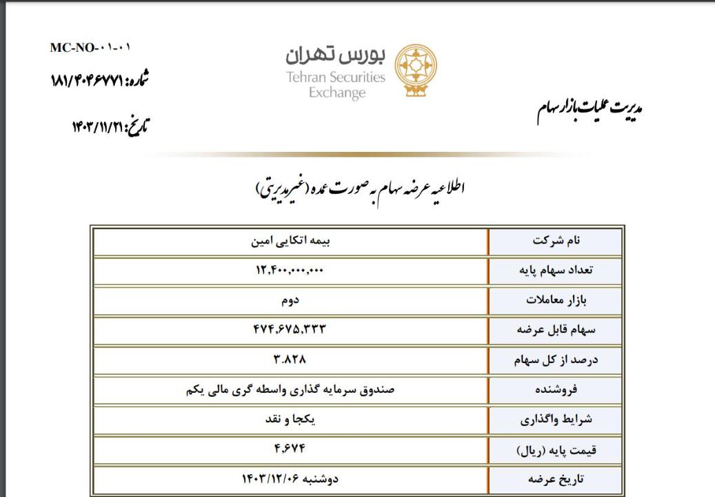 شرکت کارگزاری بانک مسکن طی نامه ای که روز 21 بهمن به سازمان بورس داده اعلام کرده مقدار 474 میلیون و 675 هزار 333 سهم معادل 3.828 درصد سهام غیرمدیریتی شرکت بیمه اتکایی امین در قیمت پایه 4674 ریال در روز 6 اسفند 1403 به نمایندگی از شرکت صندوق سرمایه گذاری واسطه گری مالی یکم عرضه خواهد شد.بصورت نقد! قیمت فعلی سهم در روز 28 بهمن ماه ماه 3270 ریال میباشد.
