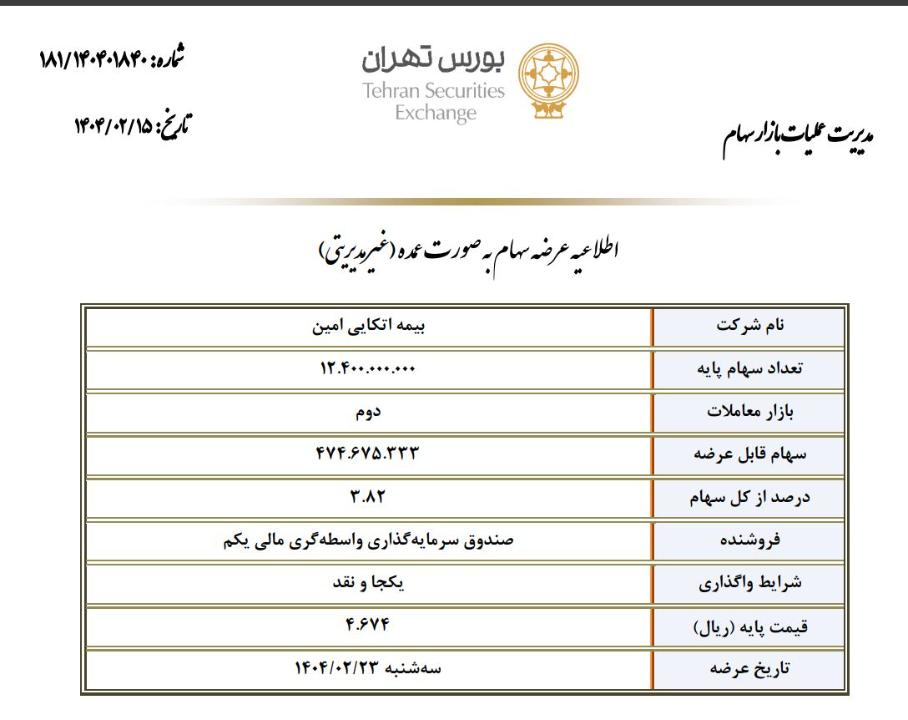 شرکت کارگزاری بانک مسکن طی نامه ای که روز 14 اردیبهشت به سازمان بورس داده اعلام کرده مقدار 474 میلیون و 675 هزار 333 سهم معادل 3.828 درصد سهام غیرمدیریتی شرکت بیمه اتکایی امین در قیمت پایه 4674 ریال در روز 23 اردیبهشت 1404 به نمایندگی از شرکت صندوق سرمایه گذاری واسطه گری مالی یکم عرضه خواهد شد.بصورت نقد! قیمت فعلی سهم در روز 22 اردیبهشت ماه 2957 ریال میباشد.