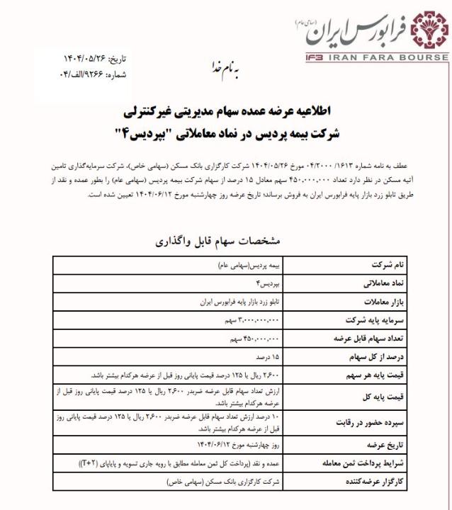 شرکت کارگزاری بانک مسکن طی نامه ای که روز 26 مرداد به سازمان فرابورس داده اعلام کرده تعداد 450 میلیون سهم معادل 15 درصد سهام عمده مدیریتی غیرکنترلی شرکت بیمه پردیس در قیمت پایه قیمت پایه هر سهم 2600 ریال یا 125 درصد قیمت پایانی روز قبل از عرضه هرکدام بیشتر باشد. در روز 12 شهریور 1404 به نمایندگی از جمعی از شرکت سرمایه گذاری تامین آتیه مسکن عرضه خواهد شد.بصورت نقد . قیمت فعلی سهم در روز 11 شهریور ماه 1034 ریال میباشد.