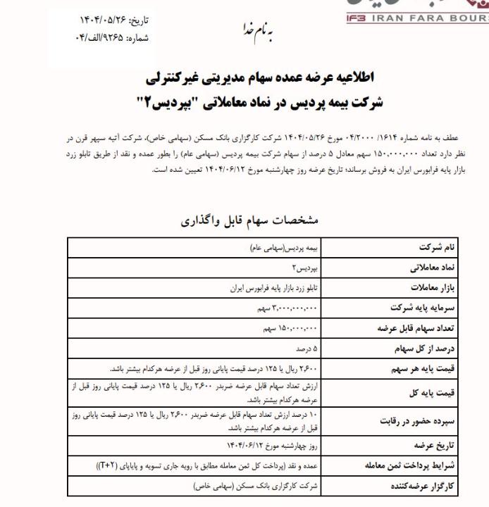 شرکت کارگزاری بانک مسکن طی نامه ای که روز 26 مرداد به سازمان فرابورس داده اعلام کرده تعداد 150 میلیون سهم معادل 5 درصد سهام عمده مدیریتی غیرکنترلی شرکت بیمه پردیس در قیمت پایه قیمت پایه هر سهم 2600 ریال یا 125 درصد قیمت پایانی روز قبل از عرضه هرکدام بیشتر باشد. در روز 12 شهریور 1404 به نمایندگی از جمعی از شرکت سرمایه گذاری تامین آتیه سپهر قرن عرضه خواهد شد.بصورت نقد . قیمت فعلی سهم در روز 11 شهریور ماه 1034 ریال میباشد.