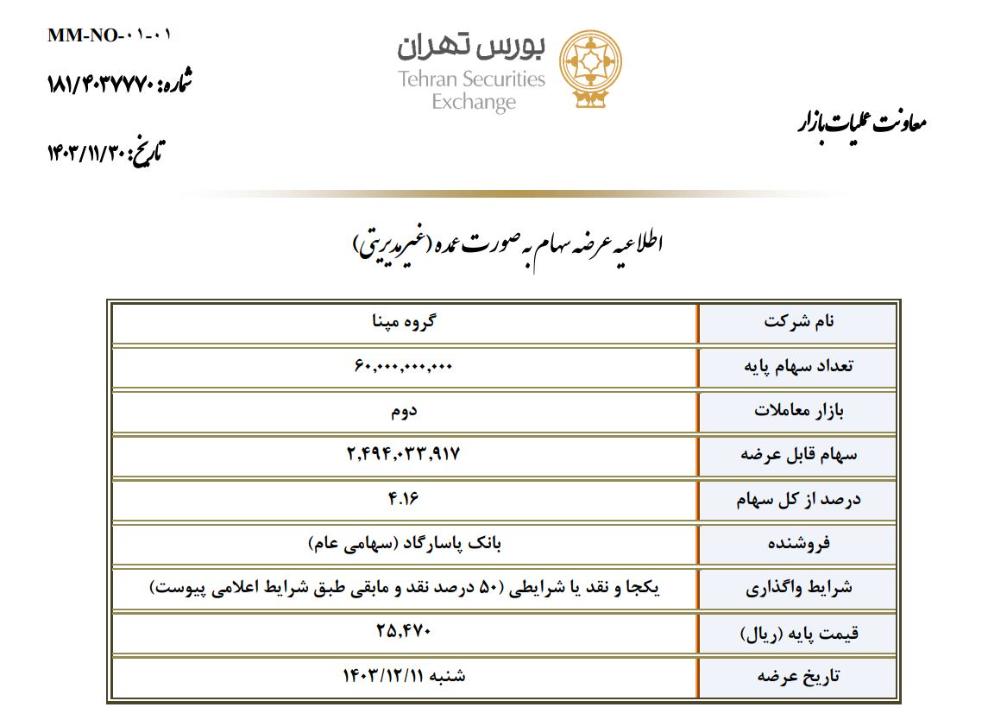 شرکت کارگزاری بانک پاسارگاد طی نامه ای که روز 29 بهمن به سازمان بورس داده اعلام کرده مقدار 2 میلیارد و 494 میلیون و 33 هزار و 917 سهم معادل 4.16 درصد سهام غیرمدیریتی شرکت گروه مپنا در قیمت پایه 25470 ریال در روز 11 اسفند 1403 به نمایندگی از شركت بانک پاسارگاد عرضه خواهد شد.بصورت نقد ! و یا نقد و اقساط قیمت فعلی سهم در روز 6 اسفند ماه 12210 ریال میباشد.
