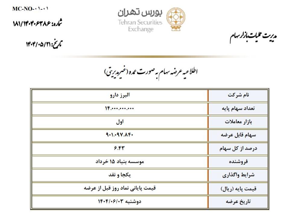 شرکت کارگزاری تدبیرگران فردا طی نامه ای که روز 21 مرداد به سازمان بورس داده اعلام کرده مقدار 901 میلیون و 97 هزار و 840 سهم معادل 6.43 درصد سهام غیرمدیریتی البرزدارو در قیمت پایه قیمت پایانی روز قبل از عرضه. در روز 3 شهریور 1404 به نمایندگی از موسسه بنیاد 15 خرداد عرضه خواهد شد.بصورت نقد . قیمت فعلی سهم در روز 22 مردادماه 3242 ریال میباشد.