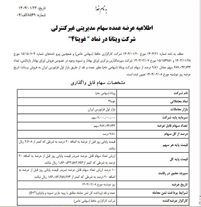 #اطلاعیه_عرضه_عمده #مدیریتی_غیرکنترلی #ویتانا #کارگزاری_حافظ #عرضه_عمده #نقد #غویتا #غویتا4