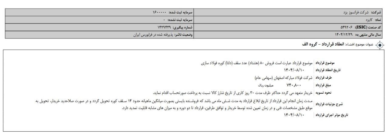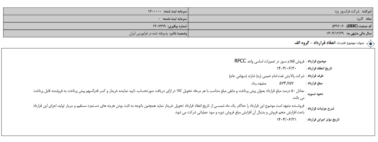 شرح جزئيات قرارداد مدت زمان انجام این قرارداد از تاریخ ابلاغ قرارداد به مدت شش ماه می باشد که فروشنده بایستی بصورت میانگین ماهیانه حدود 14 سقف کوره تحویل گردد و در صورت صلاحدید خریدار، تحویل به موقع طبق مشخصات فنی و در زمان تعیین شده توسط خریدار و توافق طرفین، قرارداد تا دو دوره و به میزان های مشابه قابلیت تمدید دارد.