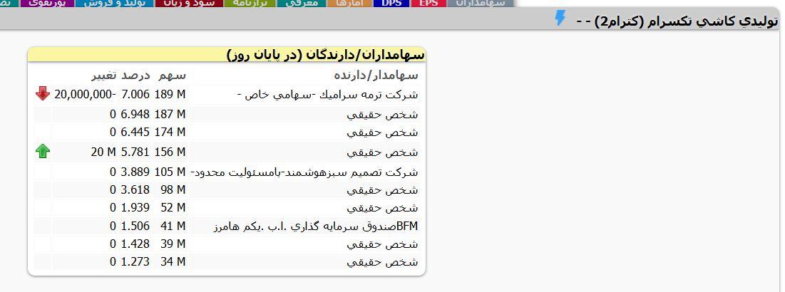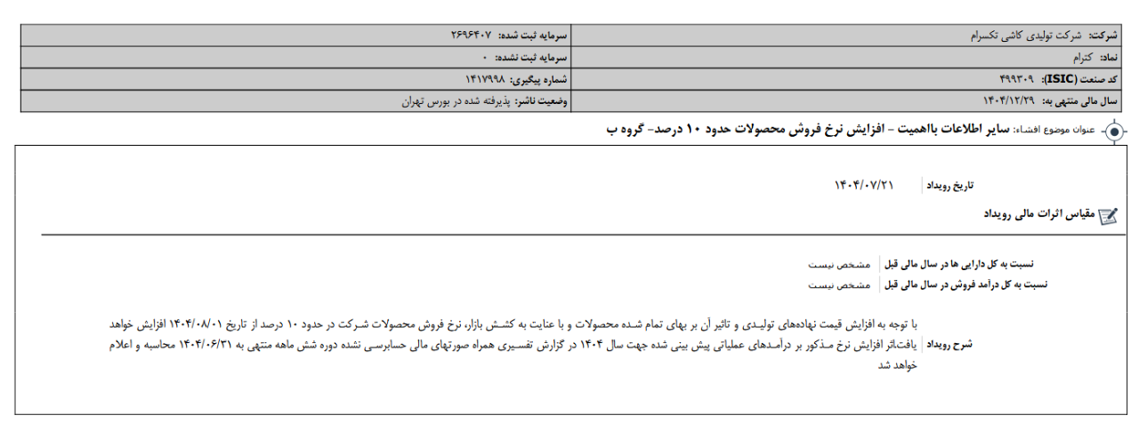 #تولیدی_کاشی_تکسرام ▪️ شرکت تولیدی کاشی تکسرام در دوره 6 ماهه منتهی به 14040631 ضمن ثبت افزایش سرمایه 59 درصد، در این دوره به ازای هر سهم 1 ریال سود محقق کرده است.