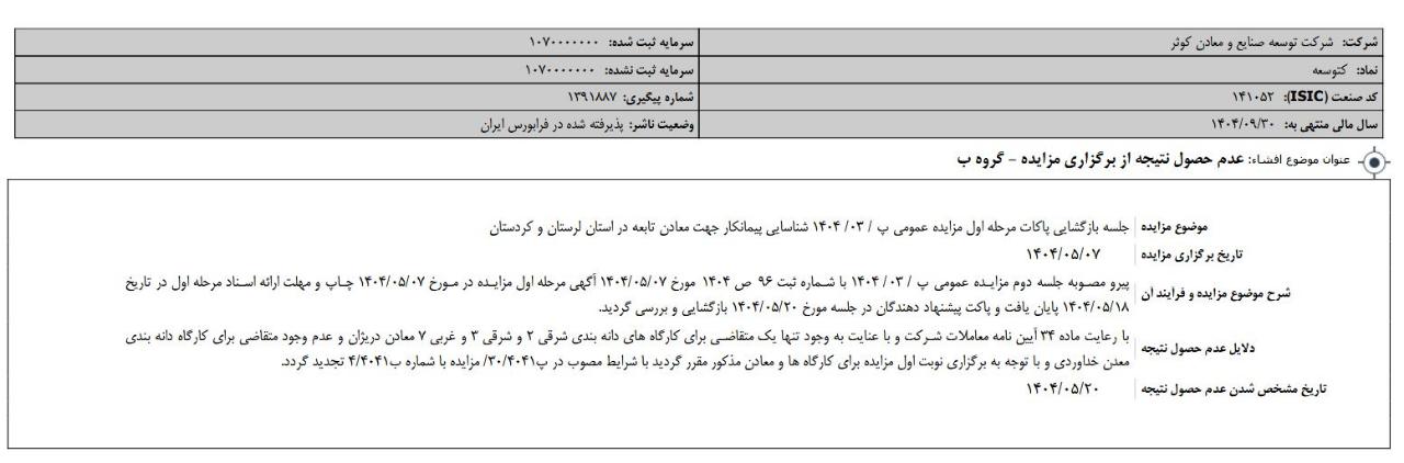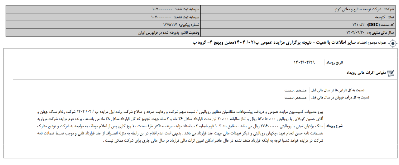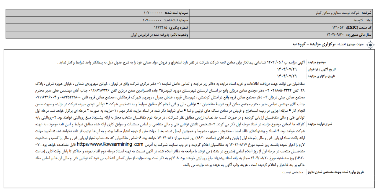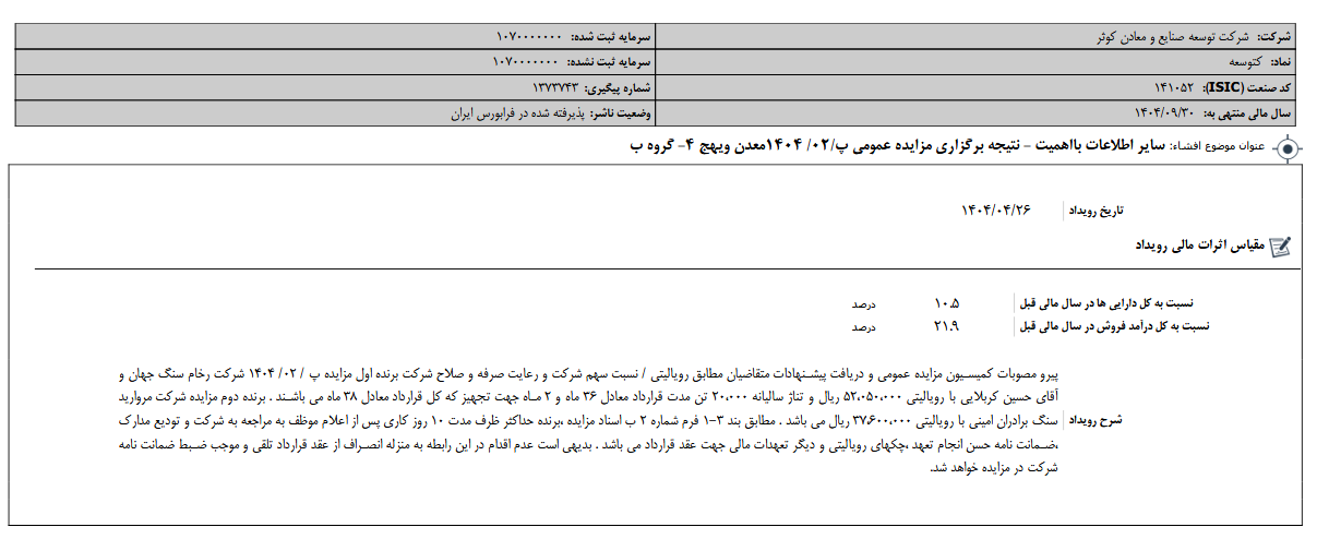 افشای اطلاعات بااهمیت، نتیجه برگزاری مزایده عمومی پ-02-1404 معدن ویهچ4-گروه ب