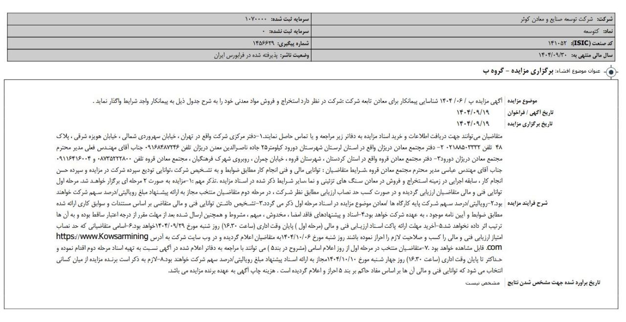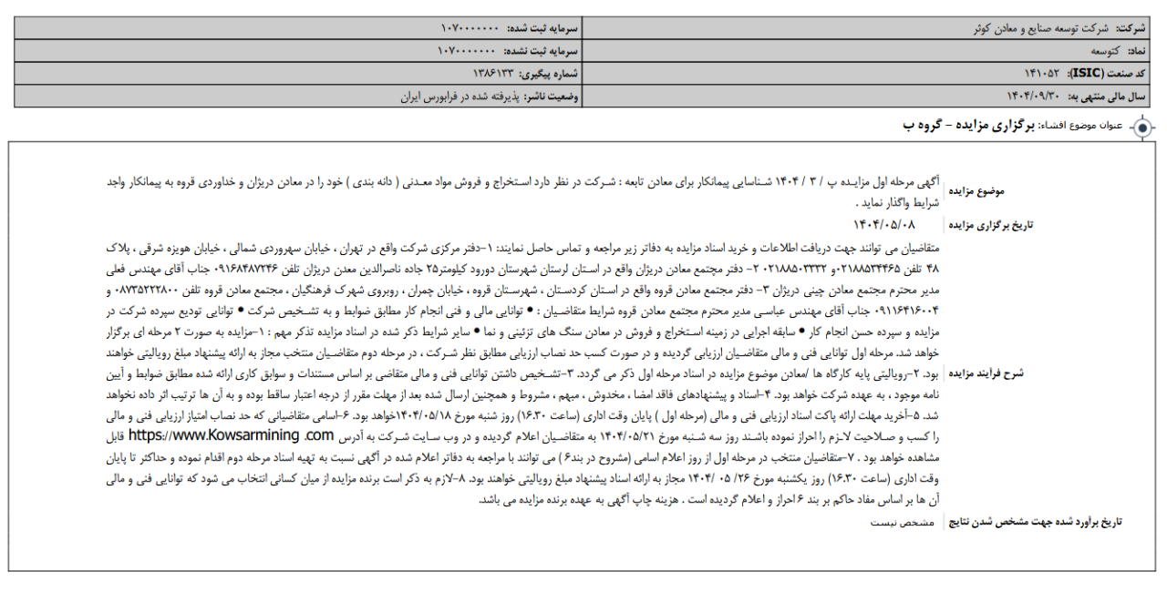 افشای اطلاعات بااهمیت، نتیجه برگزاری مزایده عمومی پ-02-1404 معدن ویهج4-گروه ب