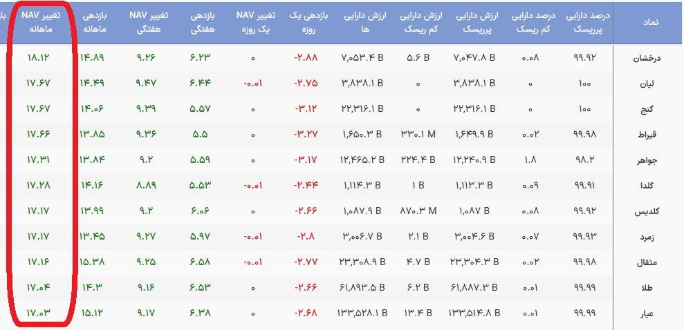 مقایسه بازدهی NAV یک ماهه صندوق های طلا