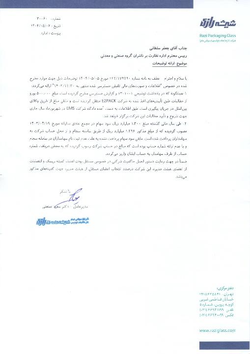 مجمع عمومی عادی سالیانه شرکت کارخانجات توليدي شيشه دارويي رازي روز 12 مرداد 1404 با حضور 58.53 درصد سهامداران برگزار شد و با تصویب مجمع از سود 142 ریالی ایجاد شده مبلغ 20 ریال بین سهامداران تقسیم شد.