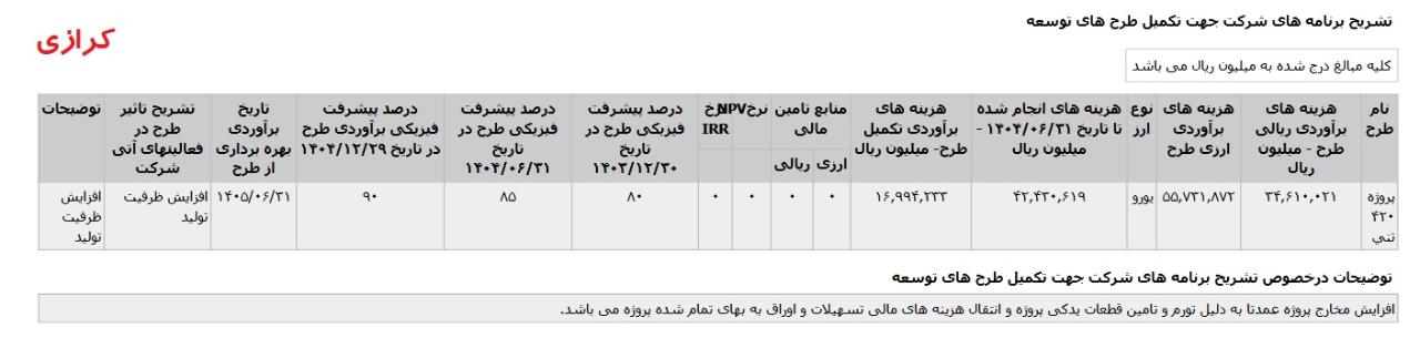 آپدیت تشریح برنامه های #کرازی جهت تکمیل طرح های توسعه منتشر شده در اطلاعات و صورتهای مالی میاندوره ای تلفیقی دوره 6ماهه منتهی به 1404.06.31 حسابرسی نشده ، تاریخ انتشار در کدال 1404.07.30 *پروژه ۴۲۰ تني ،با هزینه ی برآوردی تکمیل طرح معادل 1.699 میلیارد تومان که تاریخ برآوردی بهره برداری از طرح شهریور 1405 اعلام شده است. #طرح_توسعه #طرح_توسعه_کرازی