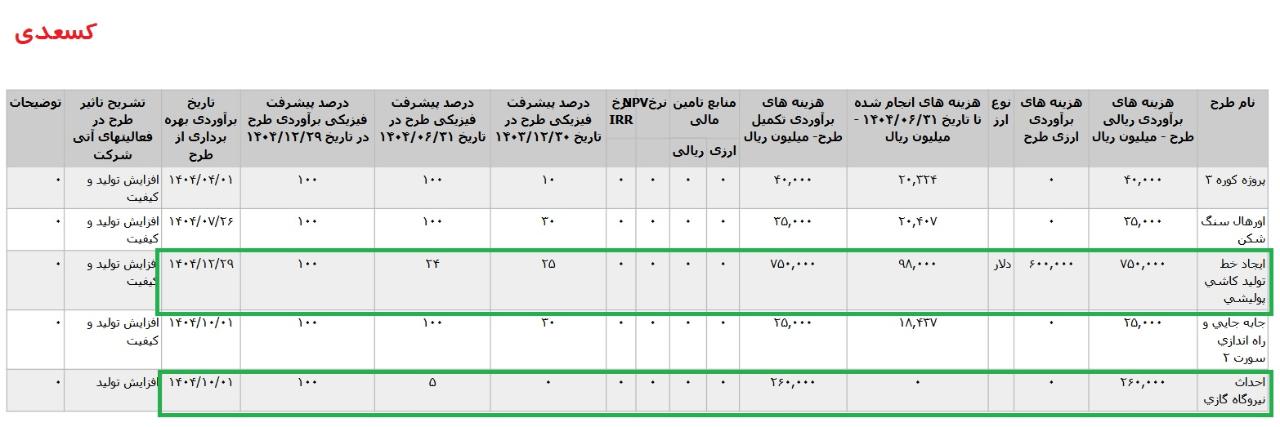 * ايجاد خط توليد کاشي پوليشي ،با هزینه ی برآوردی تکمیل طرح معادل 75 میلیارد تومان که تاریخ برآوردی بهره برداری از طرح در اسفند 1404 اعلام شده است.