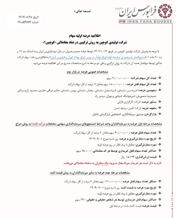 شرکت تولیدی کوچین بهزودی عرضه اولیه سهام خود را در بازار دوم فرابورس ایران انجام خواهد داد. این عرضه اولیه فرصتی جذاب برای سرمایهگذاران علاقهمند به حضور در صنعت مواد غذایی و محصولات سلامتمحور است. کارگزاری فارابی به عنوان کارگزار عرضهکننده این شرکت، با تجربه و تخصص خود آماده ارائه خدمات حرفهای به سرمایهگذاران گرامی جهت مشارکت در این رویداد مهم بازار سرمایه است.