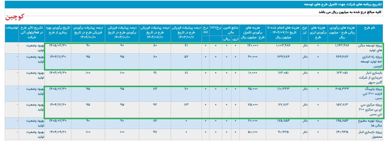 طرحهای توسعه شرکت کوچین طی سالهای اخیر با هدف افزایش ظرفیت تولید و بهبود زیرساختهای عملیاتی بهصورت پیوسته اجرا شدهاند. این پروژهها شامل توسعه و افزایش ظرفیت ۲۰۰ تنی، تکمیل سیستم CIP مرکزی، تهویه مطبوع سالنهای تولید، راهاندازی خط تولید دابودشت، توسعه تصفیه خانه، زیرساختهای برق و بازسازی انبار مواد و ملزومات هستند. میزان پیشرفت فیزیکی این پروژهها بین ۶۹ تا ۱۰۰ درصد گزارش شده و پیشبینی میشود تا پایان سال ۱۴۰۴ به اتمام برسند. هزینه انجام شده تاکنون حدود ۳,۱۶۱ میلیارد ریال است و هزینه باقیمانده حدود ۹۰۷ میلیارد ریال برآورد شده است. نرخ بازده داخلی IRR این سرمایهگذاریها ۵۳ درصد بوده و دوره بازگشت سرمایه ۳ سال و ۲ ماه پیشبینی میشود که نشاندهنده کارایی بالای این طرحها در ارتقاء عملکرد شرکت است.