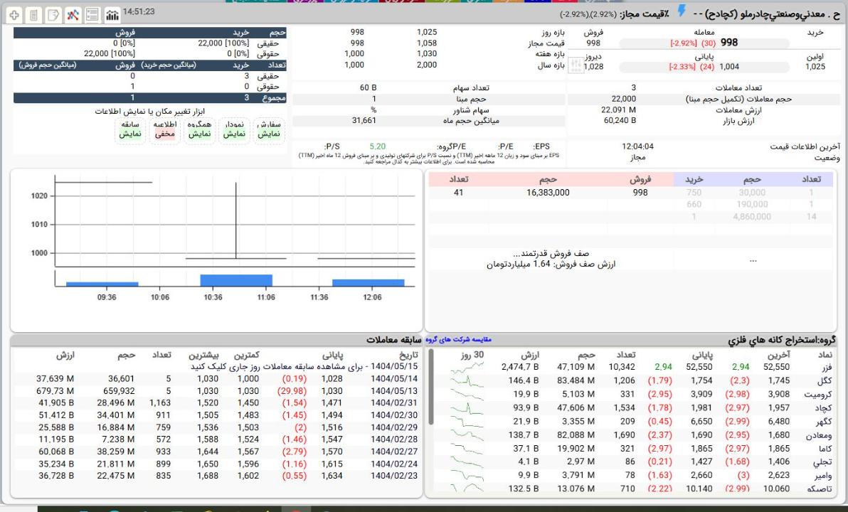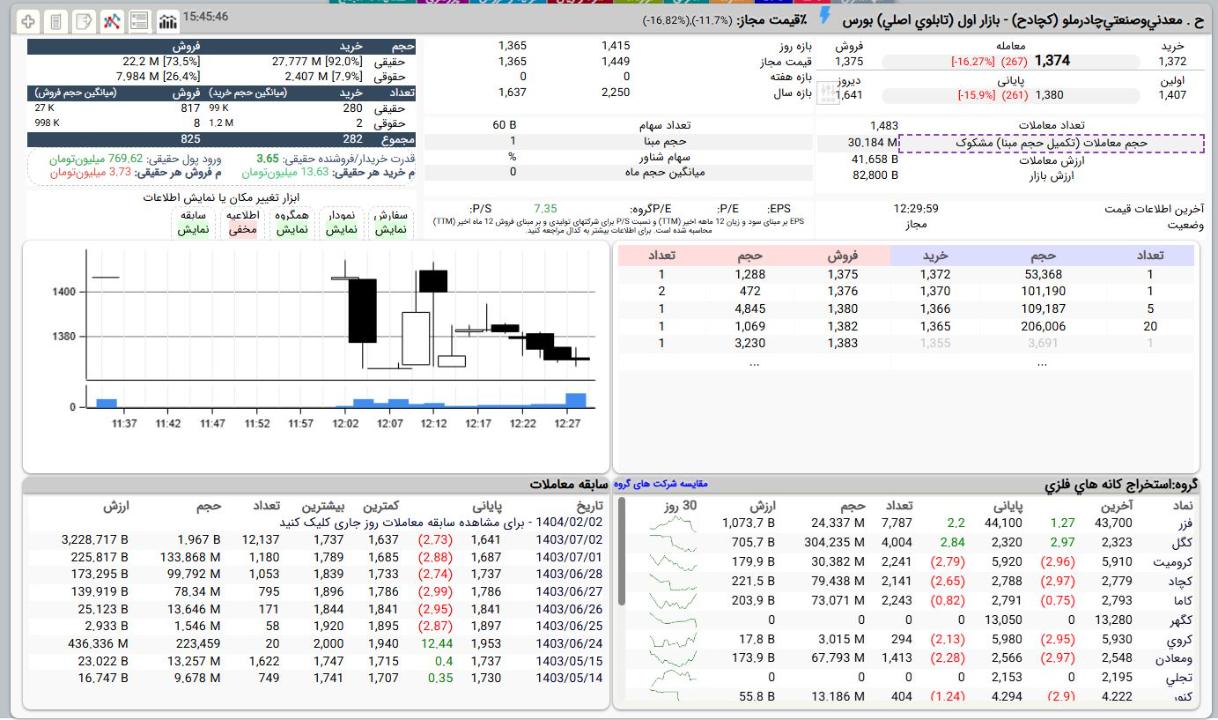 در نماد کچادح امروز 2 مرداد 1403 تعداد 40 میلیون سهم به صورت بلوکی معامله گردید خریدار و فروشنده حق تقدم معدنيوصنعتي چادرملو در این معامله بلوکی حقوقی بودند. قیمت هر سهم 1924 ریال بود