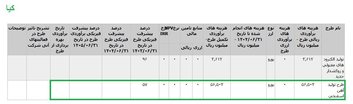 *طرح توليد آهن اسفنجي ، با هزینه ی برآوردی تکمیل طرح معادل 6 میلیارد تومان که تاریخ برآوردی بهره برداری از طرح اعلام نشده است