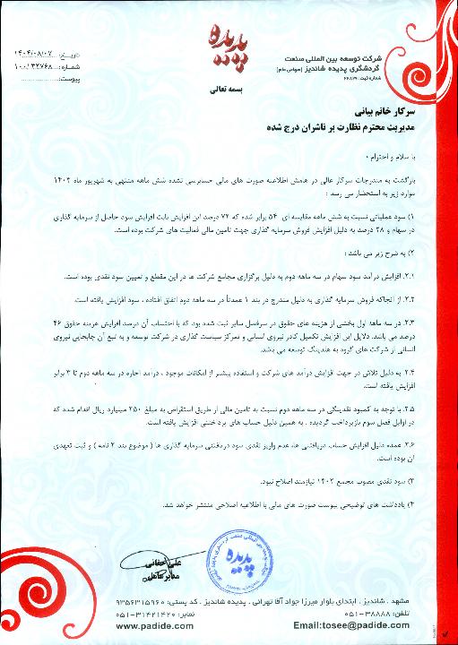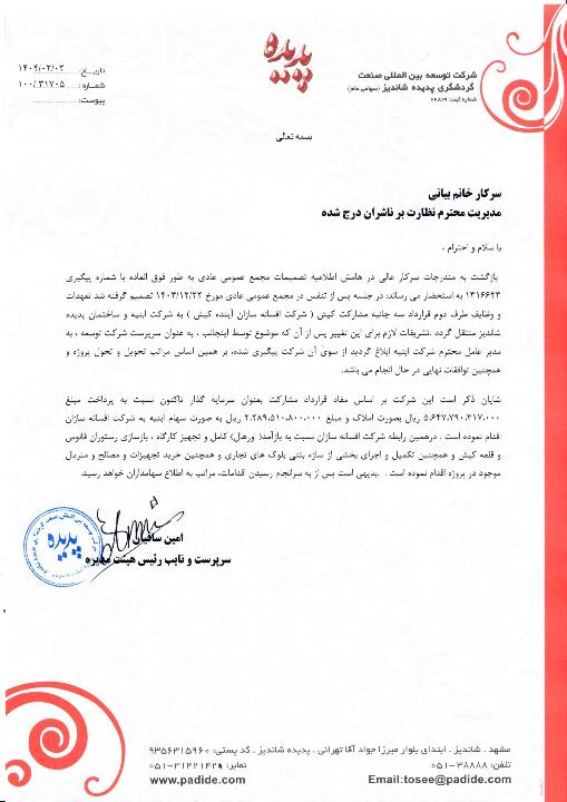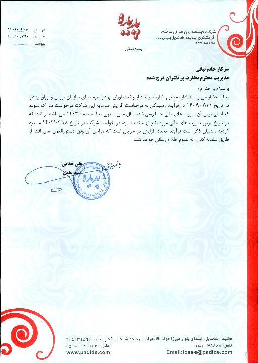 مجمع عمومی عادی سالیانه شرکت توسعه بين المللي صنعت گردشگري پديده شانديز روز 13 مرداد 1404 با حضور 25.84 درصد سهامداران برگزار شد و با تصویب مجمع از سود 1796 ریالی ایجاد شده مبلغ 180 ریال بین سهامداران تقسیم شد.